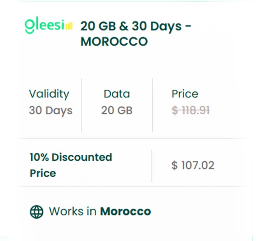Go to Gleesim.com and choose your most convenient eSIM Morocco plan according to the duration of the trip and the amount of data.